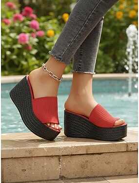 Sandálias plataforma femininas vermelhas com salto anabela – cabedal em tecido de malha elástica, estilo casual moderno para uso diário, viagens, compras, férias na praia e passeios de verão.