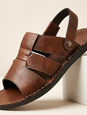 Sandálias masculinas de couro sintético marrom escuro com tiras cruzadas, calçado leve para atividades ao ar livre, ideal para férias na praia e dias ativos de verão.