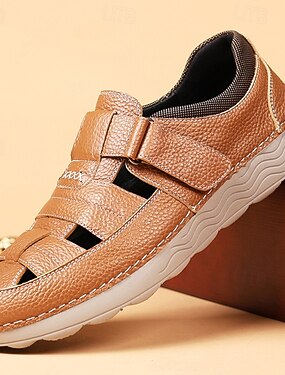 Sapatos casuais masculinos de verão, em couro sintético marrom, com bico aberto e tira ajustável, ideais para lazer, férias e atividades ao ar livre.