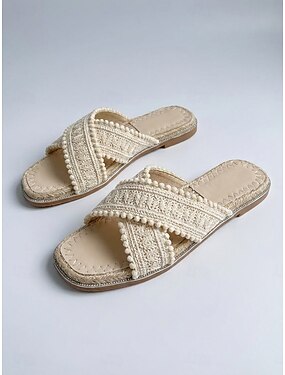 Sandálias femininas boho creme de crochê - rasteirinhas confortáveis estilo espadrille com tiras cruzadas. &Detalhe de pompom para férias na praia, resorts de verão. &viagem pela ilha