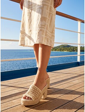 Sandálias espadrille femininas de plataforma na cor marfim, modelo anabela trançada, ideais para convidadas de casamento na praia. &férias em um resort
