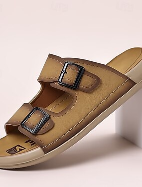 Sandálias masculinas marrons de duas tiras, com fivela e bico aberto. Calçado casual e confortável para o verão, ideal para férias na praia, viagens, resorts, lazer ao ar livre e para o dia a dia em climas quentes.