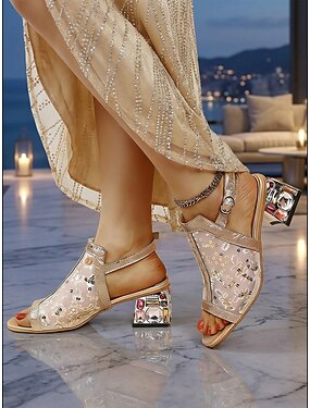 Sandálias de salto baixo e grosso para a mãe da noiva, sapatos de festa com tira no tornozelo para cerimônia e recepção de casamento, em dourado ou prateado metálico.