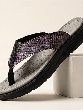 Sandálias masculinas com estampa de pele de cobra roxa, modelo chinelos leves e confortáveis, perfeitas para o verão, viagens, lazer em resorts e para o dia a dia em climas quentes.