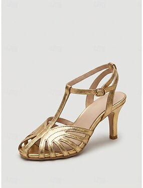 Sandálias femininas vintage estilo Gatsby dos anos 1920 com salto bloco e tira em T na cor champanhe, adornadas com strass brilhantes, perfeitas para festas, casamentos e trajes de melindrosa inspirados nos anos 20.