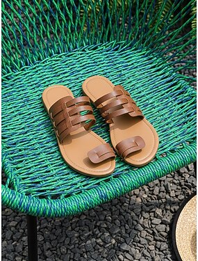 Sandálias femininas marrons de tiras com detalhe de anel no dedo, calçado casual de verão para uso diário, praia, férias e estilo descontraído.