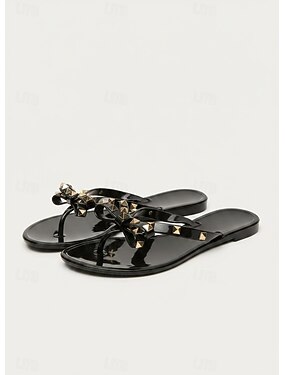 chinelos femininos pretos com laços cravejados – sandálias de praia chiques com sola plana confortável para uso casual no verão