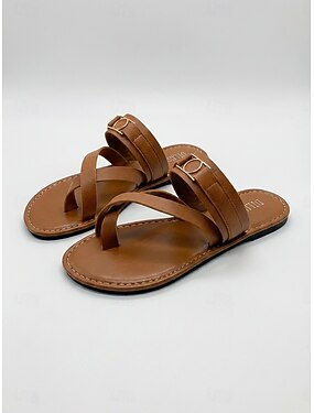sandálias rasas com fivela em T marrom para mulheres - sandálias confortáveis de couro sintético para uso diário e atividades ao ar livre