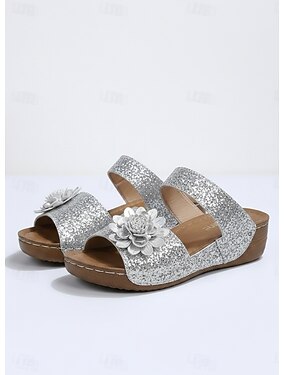 Sandálias femininas confortáveis com salto plataforma e glitter – sapatos prateados com lantejoulas e detalhes florais, ideais para festas de verão, passeios casuais e para usar em resorts.