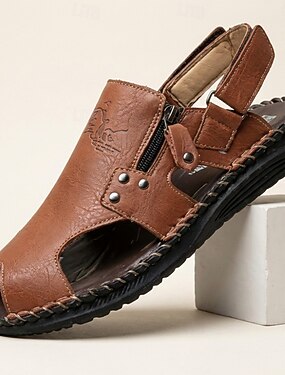Sandálias masculinas de couro sintético marrom, cabedal costurado à mão, palmilha confortável, estilo casual descontraído, ideais para momentos de lazer no verão e uso interno.