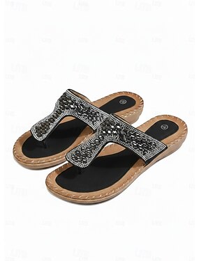 sandálias femininas de cunha com folhas de strass – sapatos de verão estilo boho com tira elástica para uso casual, praia ou férias