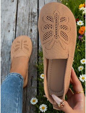 Sapatos femininos de malha marrom claro com estampa de borboleta – sapatos baixos e respiráveis para caminhadas de verão, dirigir e conforto casual.