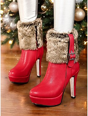 Botas de natal femininas com salto alto vermelho e acabamento em pele, plataforma e fivela – sapatos festivos de inverno