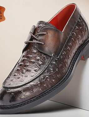 Sapatos derby masculinos de luxo, em couro genuíno marrom com textura de avestruz, modelo clássico com cadarço, ideais para homens de negócios, escritório, casamentos, banquetes e para um estilo refinado de cavalheiro.