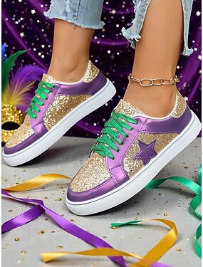 Tênis Metálicos com Gliter Dourado Femininos de Mardi Gras Sapatos de Moda Leves para Roupas de Festival Uso Diário Viagens e Eventos de Celebração