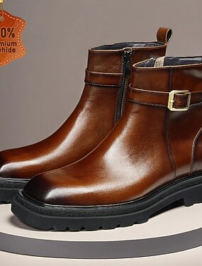 Botas masculinas de cano curto com fivela marrom, clássicas, casuais, com zíper lateral e tira decorativa para escritório, festas e uso diário