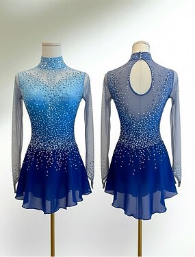 Vestidos para Patinação Artística Mulheres Patinação no Gelo Vestidos Azul+Azul Claro Patchwork Thumbhole Com Stretch Treino Competição Roupa para Patinação Clássico Cristal / Strass Manga Longa