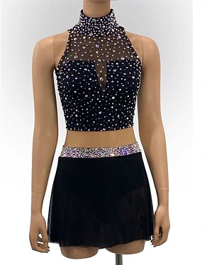 Vestido de patinação artística para mulheres, vestido de patinação no gelo para meninas, preto, elástico, treinamento, competição, patinação, roupa térmica, quente, cristal/strass, sem mangas,