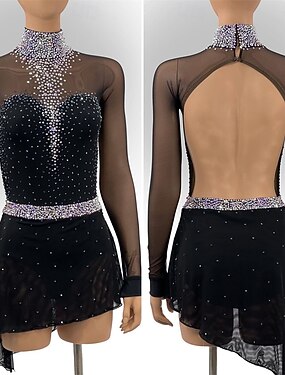 Vestidos para Patinação Artística Mulheres Patinação no Gelo Vestidos Preto Patchwork Sem costas Elasticidade Alta Treino Competição Roupa para Patinação Clássico Cristal / Strass Manga Longa