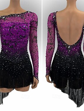 Vestidos para Patinação Artística Mulheres Patinação no Gelo Vestidos Violeta Patchwork Sem costas Com Stretch Treino Competição Roupa para Patinação Clássico Cristal / Strass Manga Longa Patinação