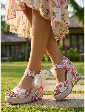 Sandálias plataforma femininas rosa vibrantes com estampa floral - confortáveis espadrilles com tira de laço no tornozelo, ideais para resorts ao ar livre e férias em destinos tropicais. &casamentos