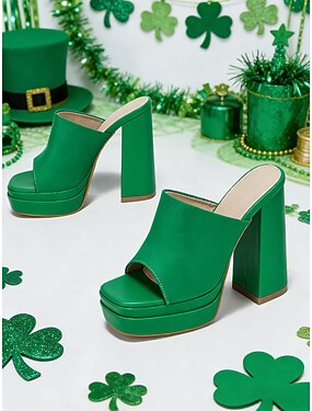 Sapatos mule de plataforma verdes femininos, sapatos de festa de cetim com bico aberto para o Dia de São Patrício.