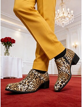 Sapatos sociais masculinos em couro sintético com estampa de leopardo, sapatos de casamento ousados para noivos modernos e celebrações especiais.