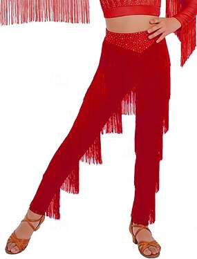 Calças latinas vermelhas com franjas - roupa de dança com camadas de borlas e detalhes em lantejoulas para salão de baile. & estágio