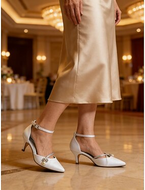 Sapatos de casamento champanhe para damas de honra, modelo scarpin de salto baixo e bico fino com tira de cristal no tornozelo, elegantes e confortáveis.