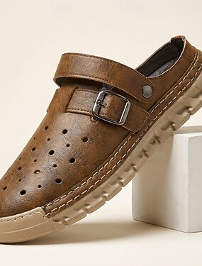 Sandálias mule masculinas marrons com fivela, sem calcanhar, perfuradas, casuais, confortáveis e respiráveis para o verão, ideais para viagens, férias, lazer ao ar livre e uso diário.