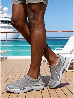 Tênis slip-on masculino cinza em malha – calçado casual leve para ilha e cruzeiro, respirável para viagens e resorts.