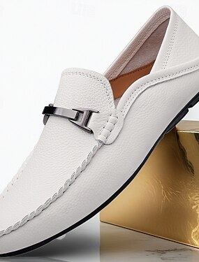 Mocassins masculinos brancos de couro sintético com fivela de metal, calçados clássicos casuais para o trabalho, casamentos e uso diário.