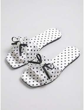 Sandálias rasteiras femininas com laço e estampa de bolinhas – charmosas rasteirinhas com laço de pérolas, chinelos casuais e chiques para usar na piscina, em resorts e nas férias de verão.