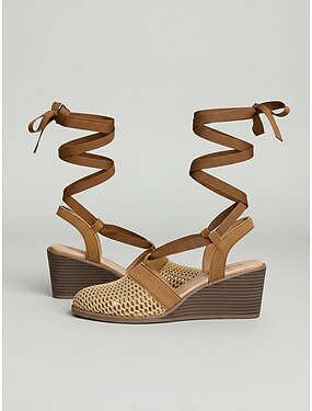 Sandálias femininas cor camelo com salto anabela e amarração - modelo casual respirável com bico fechado em tecido trançado e tiras cruzadas no tornozelo, estilo verão para férias, praia, festas no jardim, viagens e uso diário.