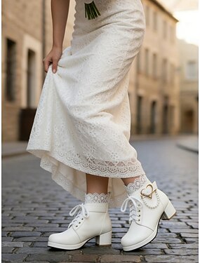 botins de noiva brancos femininos – sapatos de noiva com cadarço e decoração de coração e pérola, salto grosso para noivas de inspiração vintage