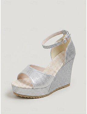 Sandálias femininas prateadas com glitter e salto plataforma - sapatos elegantes com tira no tornozelo para festas no jardim.