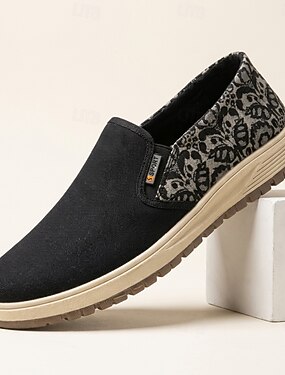 Tênis masculino slip-on casual preto e branco estampado, leve e confortável para caminhada, ideal para uso diário, viagens, looks de fim de semana, streetwear e lazer ao ar livre.