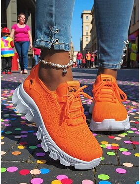 Tênis de Corrida Laranjas para Mulheres Fabricados em Malha Respirável Sapatos Atletas Confortáveis e Leves para o Carnaval Festivais e Atividades ao Ar Livre