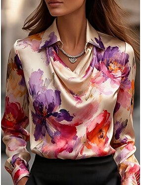 Mulheres Camisa Social Elegant Top de cetim Blusas de Seda Imprimir Com Pregas Floral Gráfico Elegante à moda Casual Manga Longa Gola Boba Tops regulares Diário Trabalho Feriado Roxo Primavera Outono
