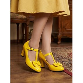 sapatos de salto alto vermelhos com tiras em T para mulheres, scarpins Mary Jane de couro envernizado com laço preto &fivela no tornozelo, sapatos de festa plataforma vintage para roupas de férias