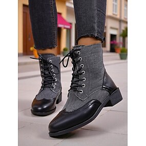 Botas de cano curto femininas pretas e cinzas com cadarço - sapatos inspirados nos brogues vintage dos anos 50 com salto grosso para uso casual e no dia a dia.