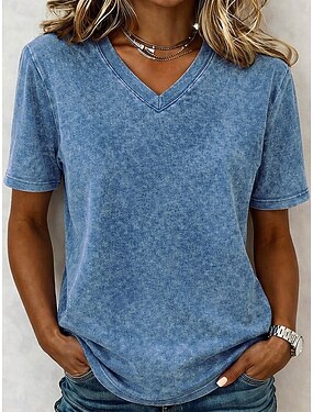 Camiseta feminina de algodão com lavagem ácida, estilo vintage, manga curta, decote em V, modelagem regular, ideal para uso casual no dia a dia, para sair, nas cores azul e roxa, azul, preta, roxa e
