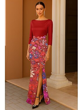 Sereia Longo Vestidos de noite Vestido formal Elegante Estilo Celebridade Manga Longa Decote Canoa Festa de Jardim Casamento com Estampa floral Franzido Fenda