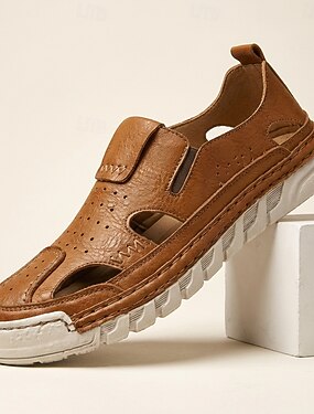 Sandálias masculinas marrons de bico fechado, estilo pescador, com tira no calcanhar, confortáveis para caminhada, respiráveis e casuais, ideais para ilhas, cruzeiros, viagens costeiras, uso em convés e férias em clima quente.