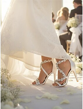 Sandálias de noiva brancas com aplicações de cristais – elegantes sandálias de salto alto com tiras para casamentos românticos.
