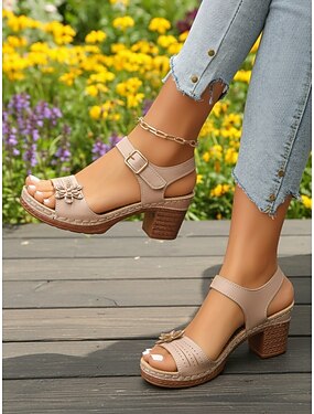 Sandálias femininas bege com salto anabela e bordado floral - design elegante de bico aberto com tira ajustável, perfeitas para passeios casuais, festas de verão e uso diário.
