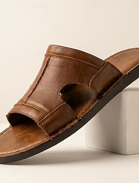 Sandálias masculinas de couro sintético marrom, modelo slide, com bico aberto, confortáveis para o verão, casuais, para praia e uso diário.