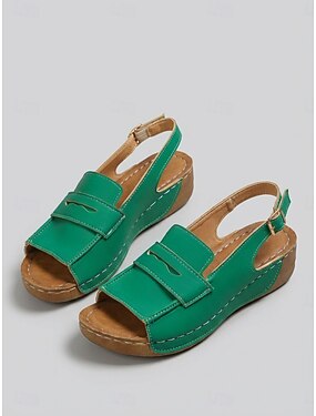 Sandálias femininas boêmias verde-escuras com salto anabela - calçado confortável para caminhada com tira elástica no calcanhar e detalhe retrô em argola de madeira, ideal para férias de verão e