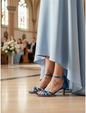 Sandálias femininas azul-acinzentadas com salto plataforma, sapatos sociais minimalistas e macios de bico aberto, ideais para convidadas de casamento em cerimônias urbanas.