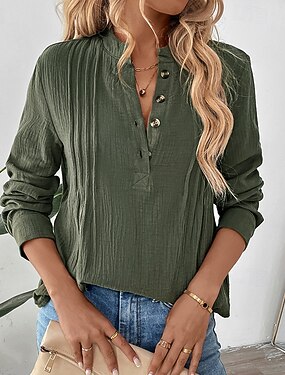 Camisa 100% Algodão Feminina Linho Falso Pregas Cor Sólida Elegante Diária Ladies Manga Longa Decote em V Alta Gola Tops Regulares Diários Trabalho Férias Verde Exército Primavera Outono